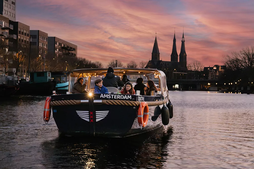 Descubre el encanto de los canales de Ámsterdam, sin importar el clima, con nuestro crucero privado por Ámsterdam. Nuestras embarcaciones especialmente diseñadas garantizan que disfrutes al máximo de los canales de Ámsterdam, ya sea que el sol brille o no. En clima soleado, el barco está abierto, y en caso de mal tiempo, está parcialmente cubierto. Decidimos esto al comienzo del día basándonos en las condiciones meteorológicas y factores externos.